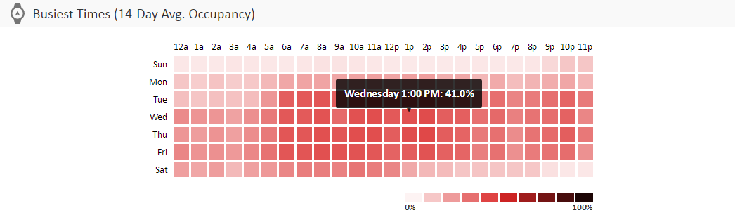 El Mapa de ocupación le permite visualizar en qué lugares ha estado más ocupada la instalación en un promedio de 14 días. Véase Informes del mapa de calor para obtener más información. |