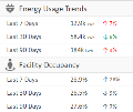 El componente Tendencias le muestra las tendencias de consumo eléctrico y los datos de ocupación de las instalaciones. Coloque el puntero sobre las flechas arriba/abajo para ver el cambio porcentual en 7, 30 o 90 días. Haga clic en la cantidad o porcentaje de energía para ver el gráfico lineal. Véase Informes en tablas para obtener más información. | |