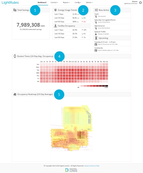 NUEVO) Después de iniciar sesión, aparece el Tablero de Control de LightRules en el que se ofrece informes inmediatos, información del consumo eléctrico y acceso inmediato al control manual de las luces. El nuevo Tablero de Control 3.0 está rediseñado para ofrecer una vista detallada y perspicaz de la instalación: