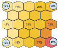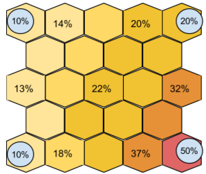 El mapa de calor es una representación visual de los datos en un espacio dado. El espacio se divide en cuadros hexagonales cuyos valores no están vinculados a un dispositivo concreto, si no los resultados de un cálculo de los valores de los dispositivos cercanos, ajustados en función de la distancia.